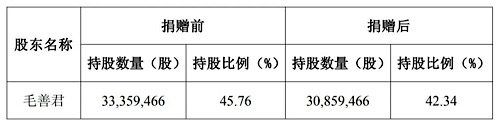公告显示,截至披露日,毛善君持有公司股份33359466股,占公司目前总股本的45.76%。为支持北京大学地球与空间科学学院教育事业的发展,更好地促进其教学科研和人才培养工作,毛善君与北京大学教育基金会于7月2日签署捐赠协议,一次性向北京大学教育基金会无偿捐赠其持有的公司股票250万股。