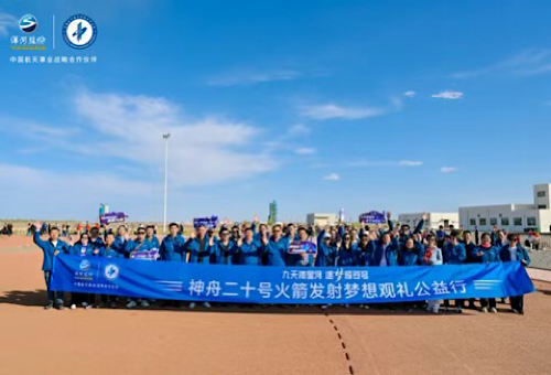 当天,由中国航天基金会、酒泉市外事和经济合作局主办,中国航天基金会梦之蓝公益专项基金(以下简称“梦之蓝公益”)作为公益支持,江苏《风流一代》杂志社作为媒体支持的“九天揽星河 逐梦耀苍穹——神舟二十号火箭发射梦想观礼公益行”活动举行。60多名劳模、突出贡献企业家、科技人才、专家学者等各界优秀人才代表组成梦想观礼团,来到发射现场,共同见证这场“宇宙级浪漫”。
