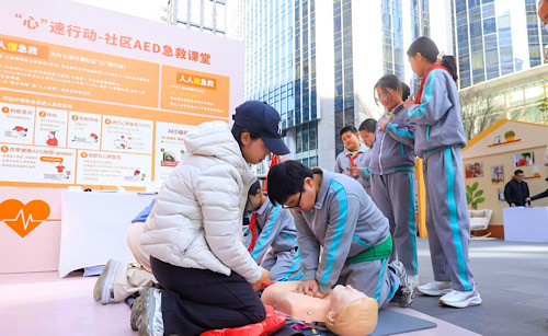 在“社区支持”板块的“汇善邻里”展位,来自广州天河南街道的社工罗文姬,专业示范心肺复苏操作与AED除颤仪的规范使用。“两只手交叉用力,按节奏按压,胳膊要垂直……”