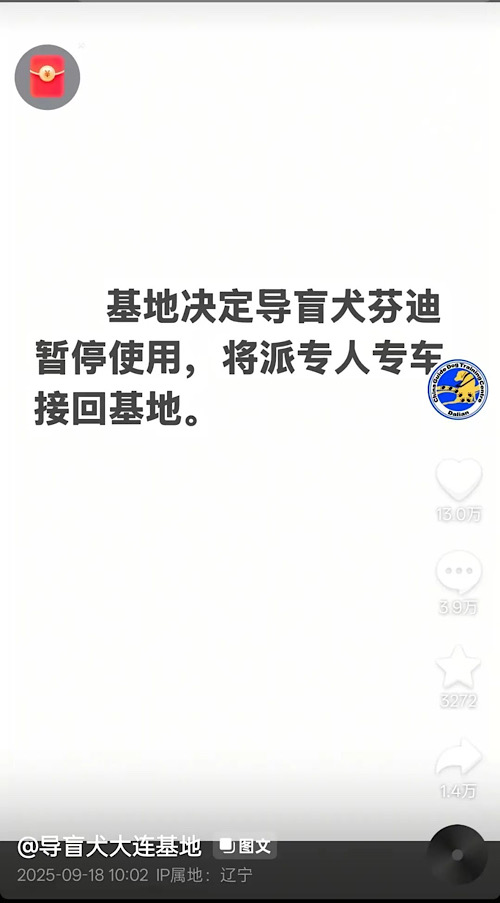 它基金相关负责人向记者表示,导盲犬是经过严格训练的工作犬,其核心使命是保障视障人士日常出行的安全与便利,如道路导航、规避障碍等。每一只合格的导盲犬都极为珍贵,其培训周期长、成本高,应被用于服务使用者最基础、最必需的生活需求。