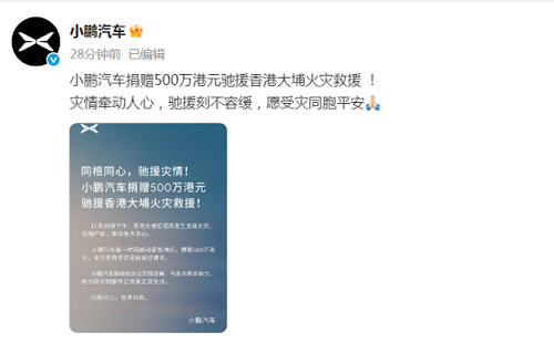 据小鹏汽车官方微博消息,火灾发生后,小鹏汽车第一时间启动紧急响应,捐赠500万港元,全力支持受灾家庭渡过难关。小鹏汽车表示,将持续关注灾情进展,与各方携手协力,助力受灾同胞早日恢复正常生活。