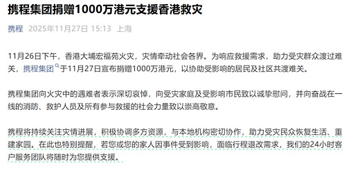 携程集团27日宣布捐赠1000万港元,以协助受影响的居民及社区共渡难关。携程方面表示,将持续关注灾情进展,积极协调多方资源,与本地机构密切协作,助力受灾民众恢复生活、重建家园。