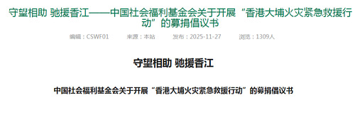 针对此次火灾,中国社会福利基金会决定立即启动“香港大埔火灾紧急救援行动”,紧急筹集善款,搭建爱心桥梁,汇聚爱心力量,全力支援香港特区政府做好灾后救助工作,帮助受灾同胞渡过难关。中国社会福利基金会在募捐倡议中表示,将募集善款通过相关机构定向转交至香港特别行政区具备资质的慈善组织,由其在当地具体落实救助工作,确保救援资金快速、精准抵达受灾同胞手中。