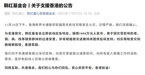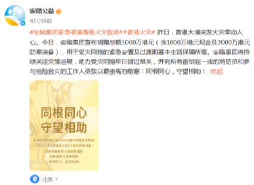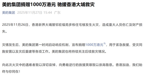 火灾发生后,361°集团第一时间启动响应机制,宣布捐赠1500万港元现金及装备,全力支持当地救援与安置工作。361度微信公众号发文称,后续361°集团将与香港社会各界携手,持续关注灾情进展,以实际行动助力灾区同胞渡过难关,为灾后援助贡献力量。