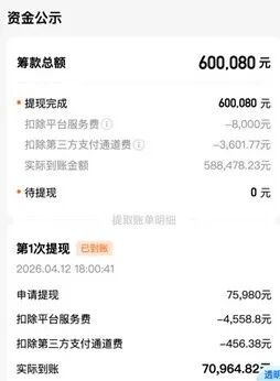 其中,4月12日,第一次提现申请75980元。扣除平台服务费4558.8元,支付通道费456.38元,实际到账70964.82元。4月13日,第二次提现申请274000元。扣除平台服务费3441.2元,支付通道费1644.42元,实际到账268914.38元。4月15日,第三次提现申请250100元。扣除支付通道费1500.97元,实际到账248599.03元。由于前两次提现已经满足单个案例提现上限8000元的要求,第三次提现不再收取平台服务费。
