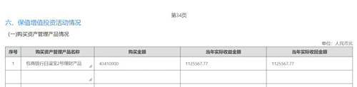 保值增值投资情况方面,年报显示,该基金会购买包商银行日溢宝2号理财产品,购买金额4341万元,当年实际收益1125567.77元。