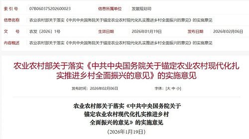 为深入贯彻2026年中央一号文件精神,2月6日,农业农村部印发《关于落实〈中共中央 国务院关于锚定农业农村现代化、扎实推进乡村全面振兴的意见〉的实施意见》(以下简称《实施意见》),从8个方面提出40项举措,旨在推动“三农”工作实现新发展新提升。
