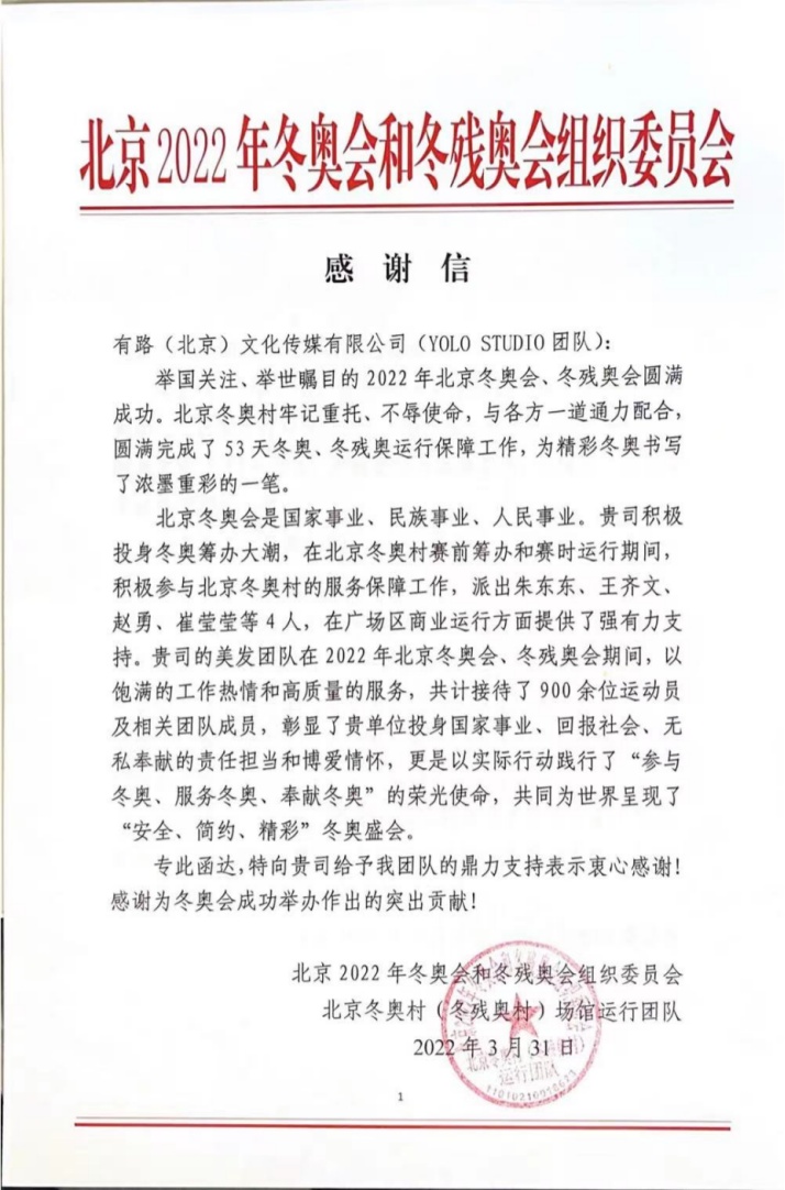 北京冬奥组委向YOLO STUDIO团队致感谢信