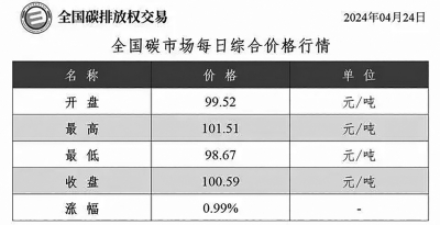 据上海环境能源交易所最新数据,截至4月24日15时,全国碳交易市场价格报收100.59元/吨,涨幅为0.99%,盘中最高价触及101.51元/吨。