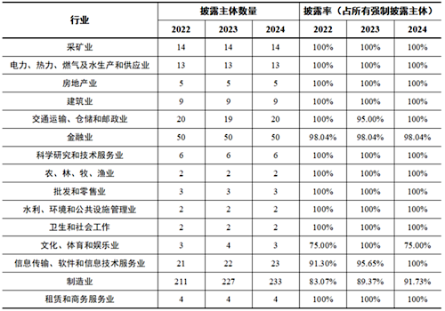 从所有制类别来看,2022至2024年度,国有控股上市公司强制披露主体的披露率均高于民营企业、公众企业等。2024年度,非国有企业强制披露主体的披露率已达90.48%(209家),国有企业的强制披露主体的披露率为99.45%(180家)。