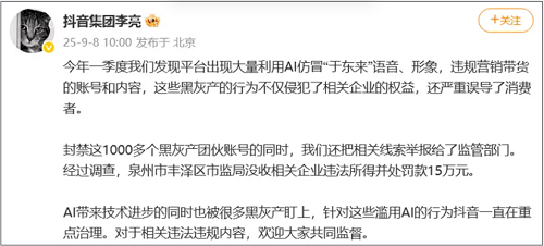 9月8日,抖音集团副总裁李亮针对当前社会AI乱象发文予以警告: