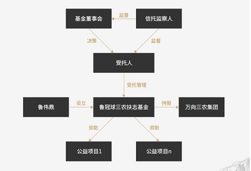 那么,这些资助具体是如何做出的呢?鲁冠球三农扶志基金、作为受托人的万向信托、万向三农集团各自扮演了不同的角色。