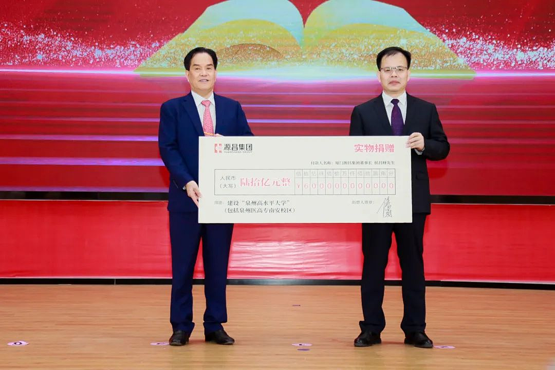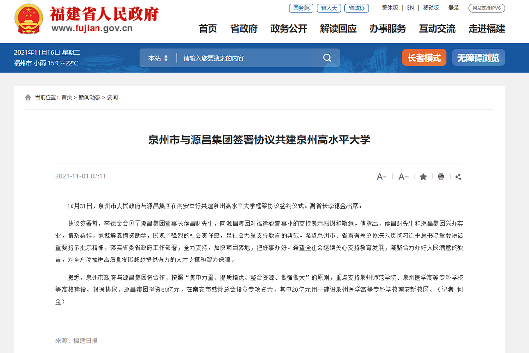 福建省人民政府官网也发布了此次捐赠信息:根据协议,源昌集团捐资60亿元,在南安市慈善总会设立专项资金,其中20亿元用于建设泉州医学高等专科学校南安新校区。