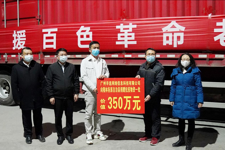 2月24日,为了向当地防疫工作者致敬以及助力当地复工复产,在《中国乡村振兴》杂志社的支持协调下,广州辛选公司向百色平果市、隆林各族自治县捐赠价值570万元的抗疫慰问物资,包括50万只口罩、上万件衣物等疫情防控和生活物资。当天,该批捐赠物资分别先后到达平果市及隆林县,并举行了简要捐赠接收仪式。平果市委常委、组织部部长杨秀程,隆林县委常委、宣传部部长施斌,隆林县政协副主席、发改局局长肖兵,隆林县工商联主席虞静云、《中国乡村振兴》杂志社视频中心主任俞得顺、广州辛选公司公益负责人辛库出席了该仪式。