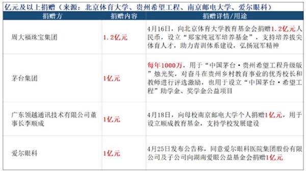 前三笔均为教育领域的捐赠。