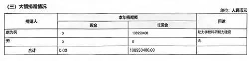 哈尔滨工业大学教育发展基金会2024年度工作报告截图记者查询哈尔滨工业大学教育发展基金会2024年度工作报告发现,2024年度基金会收到捐赠人康为民的非现金捐赠,合计金额为108950400元,捐赠用途为“助力学校科研能力建设”。