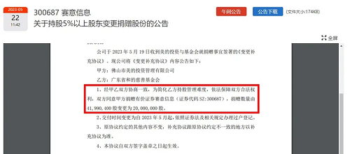 2020年6月21日,广州赛意信息科技股份有限公司发布公告称,广州赛意信息科技股份有限公司持股5%以上股东——佛山市美的投资管理有限公司与广东省和的慈善基金会签署《捐赠协议》,为推动公益慈善发展,美的投资拟向基金会无偿捐赠公司股票41990400股,占公司总股本的10.54%。按照当时的市值计算,这部分股权市值约为9.95亿元。