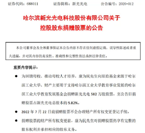 新光光电公告2020年6月2日,新光光电发布关于控股股东捐赠股票的公告。公告称,公司于2020年6月1日接到控股股东康为民通知,其与哈尔滨工业大学教育发展基金会签署了《捐赠协议书》。根据公告,为回馈母校、推动母校人才培养,康为民向哈尔滨工业大学教育发展基金会捐赠新光光电582万股股票。至公告日,捐赠股票占新光光电总股本的5.82%。按照当时股价计算,这批股票价值高达2.4亿元。