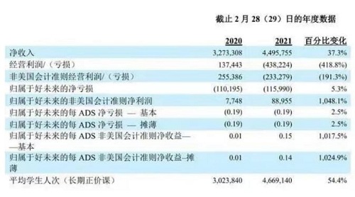 2021财年全年净收入从上年的32.733亿美元增长到44.958亿美元,增幅为37.3%;归属于好未来的净亏损为1.160亿美元,2020财年归属于好未来的净亏损为1.102亿美元。