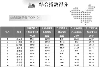 11月5日,中国慈善联合会在广州发布第五届中国城市公益慈善指数。数据显示,2016至2017年间,我国城市社会捐赠稳步增长,社会组织数量持续增加,政府支持力度不断加大,全国城市慈善事业呈现出健康、快速发展的态势。其中,北京、广州、深圳、上海、苏州、南京、无锡、宁波、成都、长沙等城市的综合指数位居全国前列。