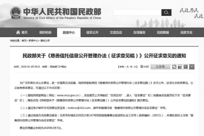 为了进一步解决慈善信托信息公开内容不够具体、程序不够规范等问题,民政部起草了《慈善信托信息公开管理办法(征求意见稿)》。