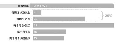 在网购的频次方面,有近3成公众每周网购1~3次,85%的公众每月网购至少1次以上,仅有15%的公众网购频率为两个月1次或更少。