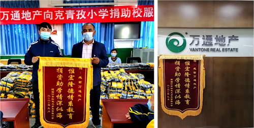 通过来自中国银保监会的援疆干部邵祥理牵线,万通发展了解到克青孜小学的孩子们缺少校服时,公司管理层当即联系北京的校服生产厂家,为全校学生订购了校服,于6月快递到学校。但由于疫情影响,新学期开学有所推迟。在开学第一天,学校特意举行了充满仪式感的校服发放活动,并特意订做锦旗用于感谢,希望这份爱心可以得到传承。