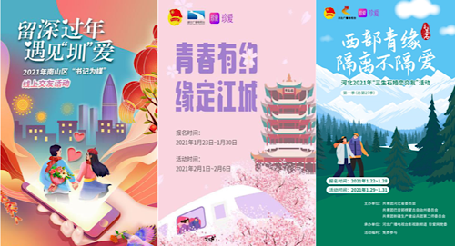 2021年春节,出于疫情防控需求,很多人没有回家而选择就地过年。为了响应中共中央、国务院《关于做好人民群众就地过年服务保障工作的通知》,让就地过年的单身青年感受到温暖欢愉的节日氛围,春节假期前后,知名婚恋服务企业珍爱网在党建引领下,协同深圳、武汉、南京、河北等全国多地党团组织,举办系列“云相亲”公益交友活动,帮助近万名单身青年寻找幸福。