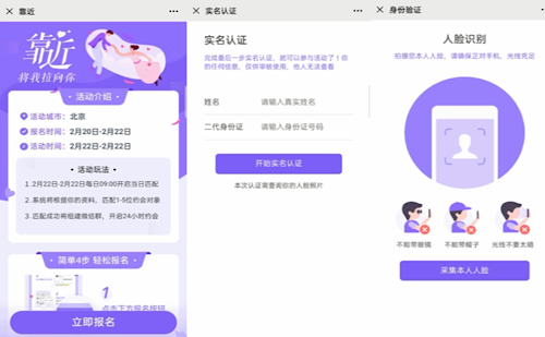 珍爱网交友小程序“靠近”报名及双重身份认证页面