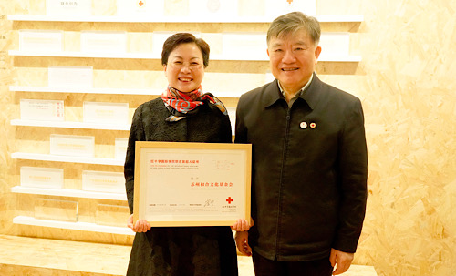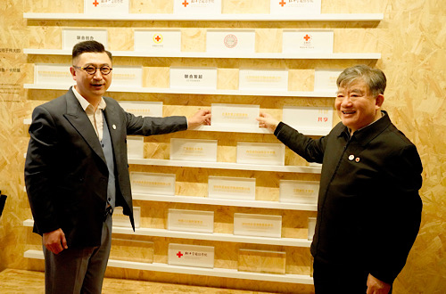 陈竺在参观红十字国际学院一楼展厅时,为上海大丰公益基金会、苏州和合文化基金会颁发了“红十字国际学院联合发起人”荣誉证书,并对两家基金会捐资支持学院建设表示感谢和敬意。