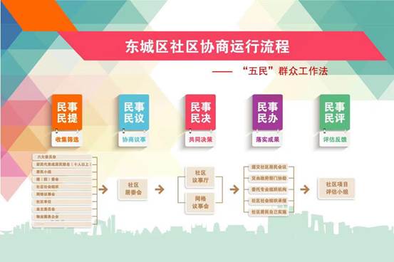 社区议事协商是征询民意、寻求共识的重要过程,民主协商的基层实践,也是解决问题的前提和基础。怎么进行社区议事协商呢?哪些方式方法是有效的?这既是基层民主协商实践的关键问题,又是基层工作者需要掌握的基本技能。东城区在多年实践的基层上总结出“五民工作法”,专门编制了《东城区“五民工作法”操作指引》,具体指导社区各级议事协商的有效实施,打造了一批示范性的社区议事厅,使社区议事协商有阵地、有组织、有方法、有体系。