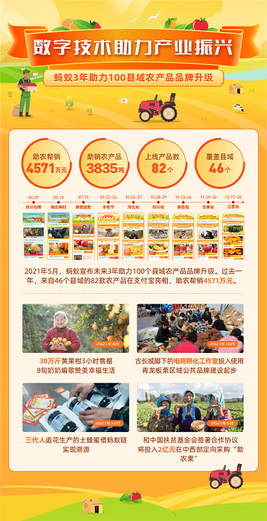 去年5月,蚂蚁集团在乡村致富大会上提出六项助农目标,在助力乡村产业振兴层面,蚂蚁表示,将在未来三年助力100个县域农产品品牌升级。