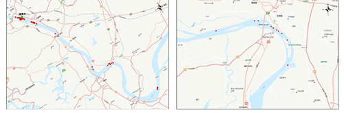 超声波标记中华鲟在宜昌江段(左)和荆州江段(右)