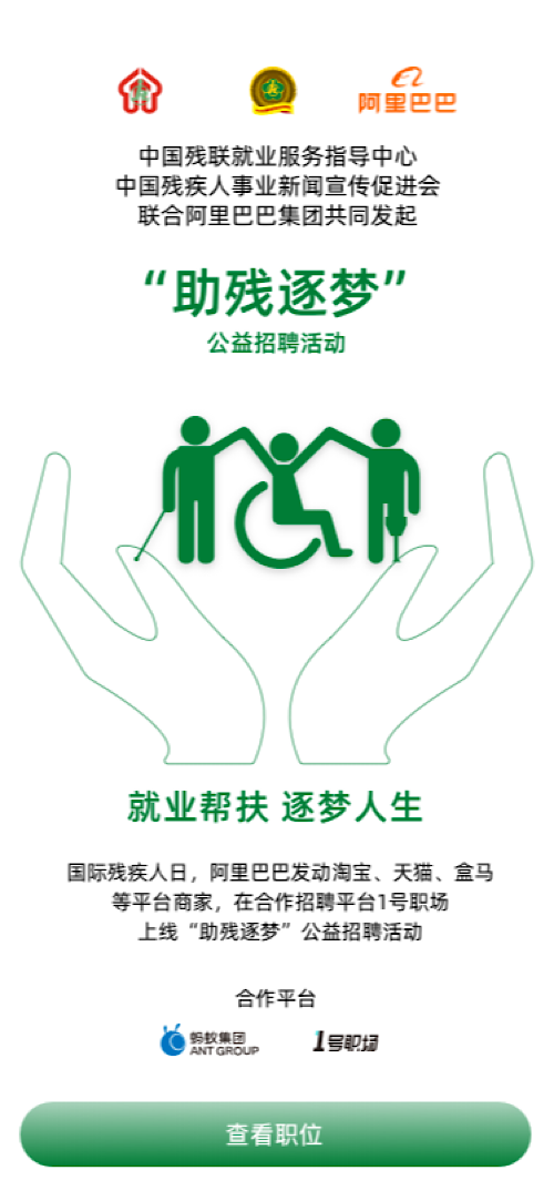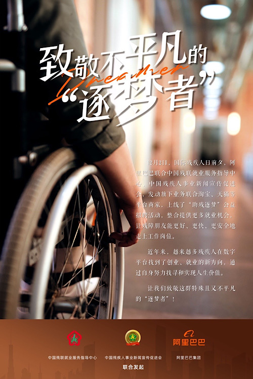12月2日,阿里巴巴联合中国残联就业服务指导中心,中国残疾人事业新闻宣传促进会,上线“助残逐梦”公益招聘活动