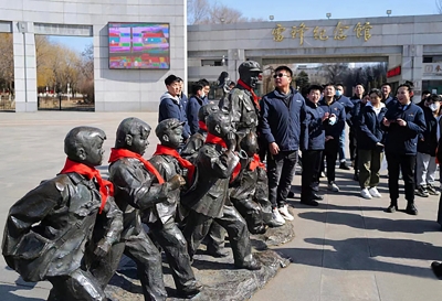 3月2日,辽宁省抚顺市雷锋纪念馆门前,来参观的青年在雷锋塑像旁