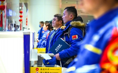 蓝天救援队队员准备登机前往土耳其伊斯坦布尔,驰援地震灾区