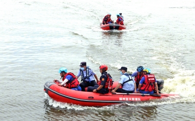 江苏宝应县公安局水上派出所、射阳湖派出所联合蓝天救援队员在射阳湖镇辖区水域内开展水上实战救援训练