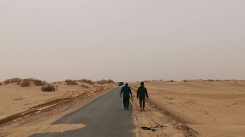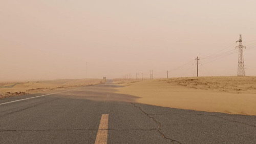 大风天气里,公路两边的沙子正在肉眼可见地移动