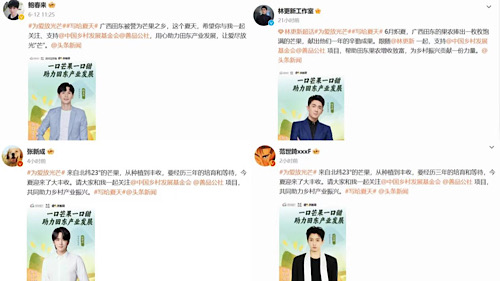 发布会前,中国乡村发展基金会邀请鲍春来、林更新、张新成、杜海涛、范世锜等多位明星,担任中国乡村发展基金会助农宣传员,通过微博发声,为田东芒果果农联合打CALL,助力百色芒果品牌影响力打造,让更多消费者知晓和品尝到百色芒果,支持当地产业发展。