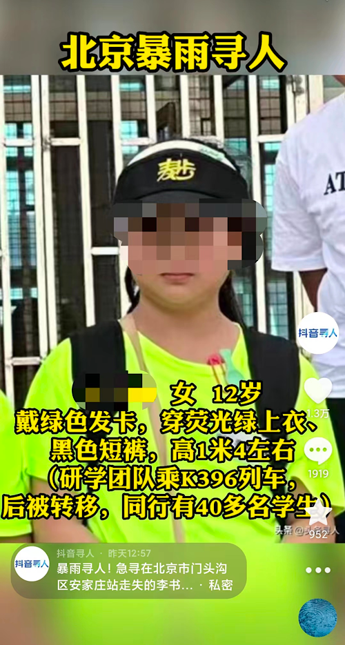 内蒙古乌海市的李女士也是求助寻人者之一,7月31日,她12岁的女儿在跟随暑期研学班乘K396次列车前往北京的路上失联。李女士表示,研学班学生与老师共计50人左右,失联前孩子联系她,称列车停在北京市门头沟区,前方路段有塌方落石。此后,李女士和其他家长失去了孩子们的消息,只能通过看新闻得知k396次列车营救和安置情况。