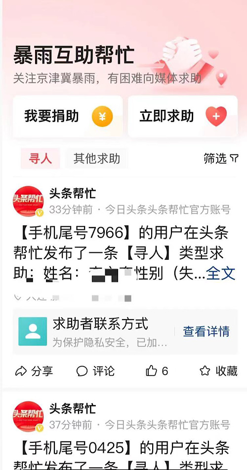 抖音、今日头条开通“暴雨紧急寻人”服务,已找到7名失联者