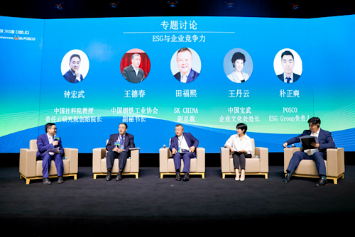 在最后的“专题讨论”环节,中国社科院教授、责任云研究院创始院长钟宏武、中国钢铁工业协会副秘书长王德春、SK中国副总裁田福熙、宝武集团企业文化处处长王丹云、浦项集团POSCO ESG Group负责人朴正奭等嘉宾围绕“ESG与企业竞争力”这一主题进行了讨论和分享。