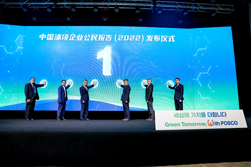 会上,《中国浦项企业公民报告2022》发布仪式正式启动,该报告围绕POSCO企业公民的责任定位,根据ESG的环境、社会、治理三个维度,设置“Environmental:发展‘项’绿色,守护一片净土”“Social:责任‘项’未来,筑就一个家园”“Governance:治理‘项’卓越,打造一方蓝天”三大章节,全面展示了中国浦项2022年度履行企业公民责任、推动社会可持续发展的实践和成果,系统回应了员工、客户、供应商、合作公司、地区社会等利益相关方关注的焦点热点事件,体现了浦项与各利益相关方携手,追求合作共赢,共同创造绿色可持续的未来。