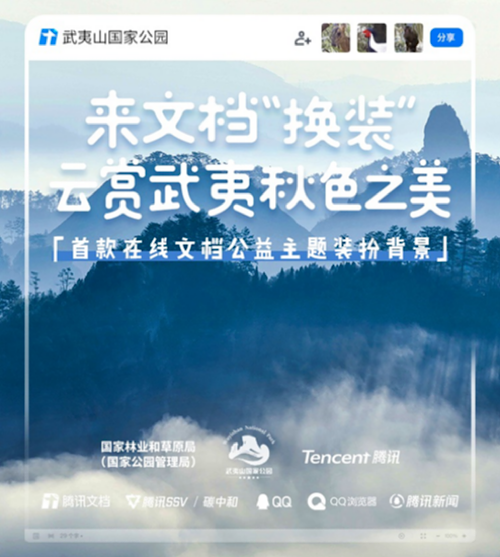自去年起,腾讯文档持续通过打造互动功能,向公众倡导普及低碳环保的理念及行为。秋分之际,联合武夷山国家公园推出的国内首款在线文档公益主题装扮背景,将群峰日出、狮峰云海、黄岗林海、三才秋色、齐云茶园、黄叶秋深6种武夷山国家公园内极具代表性的景物风光,“搬”到用户桌面,让超过58万的用户实现了云赏祖国秋色、拥抱有氧工作的体验。