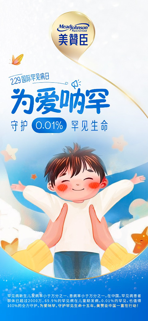 2月29日,第17届国际罕见病日。美赞臣、美赞臣公益基金会携手病痛挑战基金会、阿里公益,联合发起柠檬宝宝关爱行动,发挥美赞臣中国国内国际两种资源优势,共同为中国罕见病患儿提供罕见病配方粉供应方案。同日,美赞臣中国在新浪微博发起#为0.01%生命呐罕#话题互动,推动社会更多人认知、关爱、支持罕见病群体,为他们及其家庭营造互助包容尊重的社会环境。