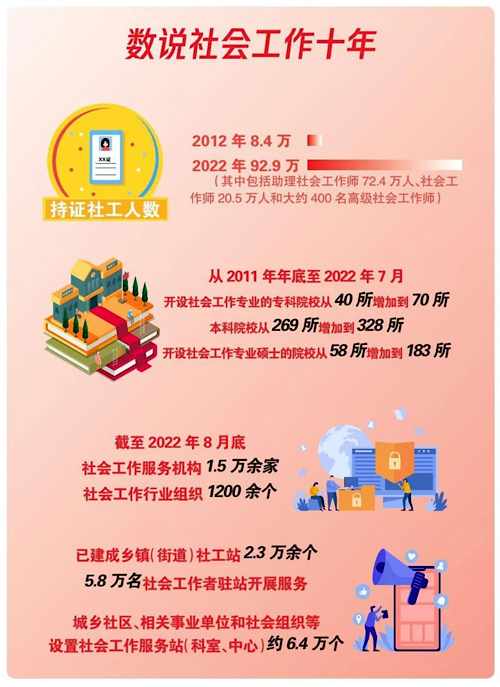 人民群众对美好生活的向往,对心理健康、人际和谐、社会参与的渴望,为社会工作发展提供了源源不竭的动力,我国社会工作专业人才总量不断壮大。同时,社会工作者发挥着重要的作用,他们扎根于基层,输出专业服务,让人民群众的生活更有温情、更有品质、更有尊严。