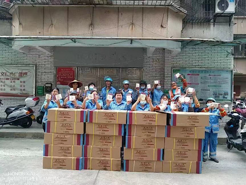 4月12日,捐赠物资首先到达江门,随后,陆续送达乐昌市等地,乐昌市政法委副书记骆学文书记出席捐赠仪式并为岭南彩基金、香雪制药颁发锦旗,现场慰问了环卫工人。其他地区的捐赠物资也相继送达。