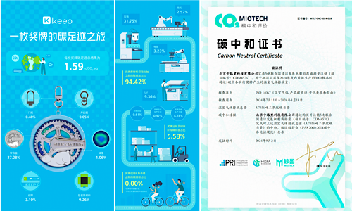 除了精美的外观,值得一提的是,此次 Keep设计团队通过优化设计和生产工艺,最大限度减少生产过程中的能源消耗和废物产生。从原料采集、制造过程到最终的分发,每一环节都严格控制碳排放,确保整个生产流程低碳环保。此外,Keep 还利用专业的碳足迹评估工具,让奖牌的整个生命周期实现了碳足迹跟踪,并获得专业机构颁发的碳中和认证证书。
