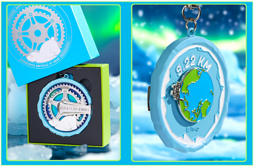此次Keep“冰川骑迹”奖牌整体以冰川为设计灵感,采用独特的齿轮造型,保持了 Keep 骑行赛奖牌一贯的旋转风格,奖牌边缘模拟冰川不规则造型,以天蓝色为主,底色以绝美的北极光为背景色,寓意守护冰川,希望在大众共同的努力下冰川能长久存在,极光永恒照亮纯净的冰雪世界。同时,奖牌内嵌可爱北极熊,随骑行齿轮转动而旋转,希望通过北极熊憨态可掬的模样呼唤大家守护冰川、拯救北极熊。