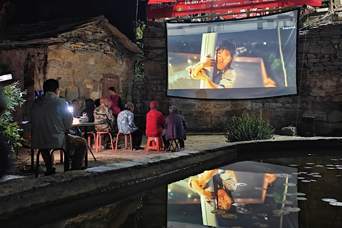 张秋花(右二)和村里老人们现场观影